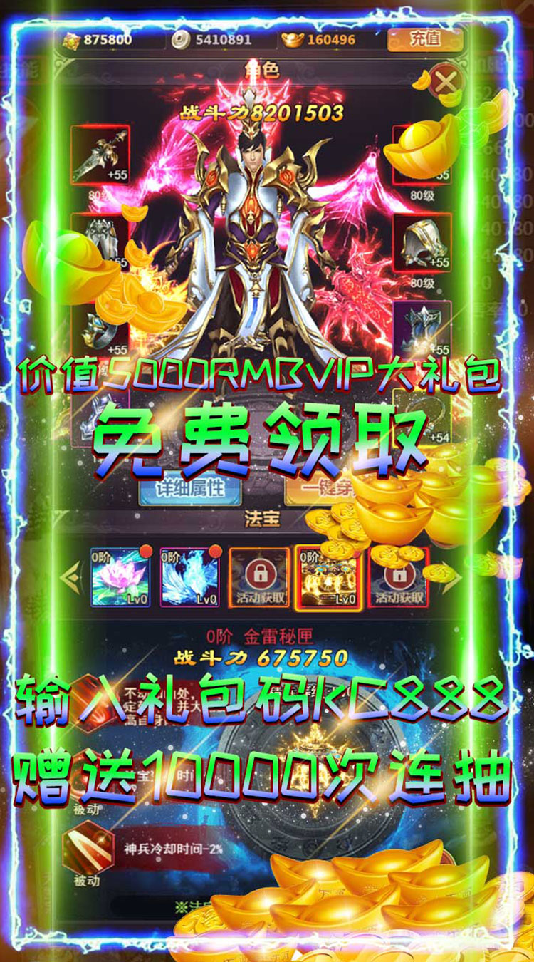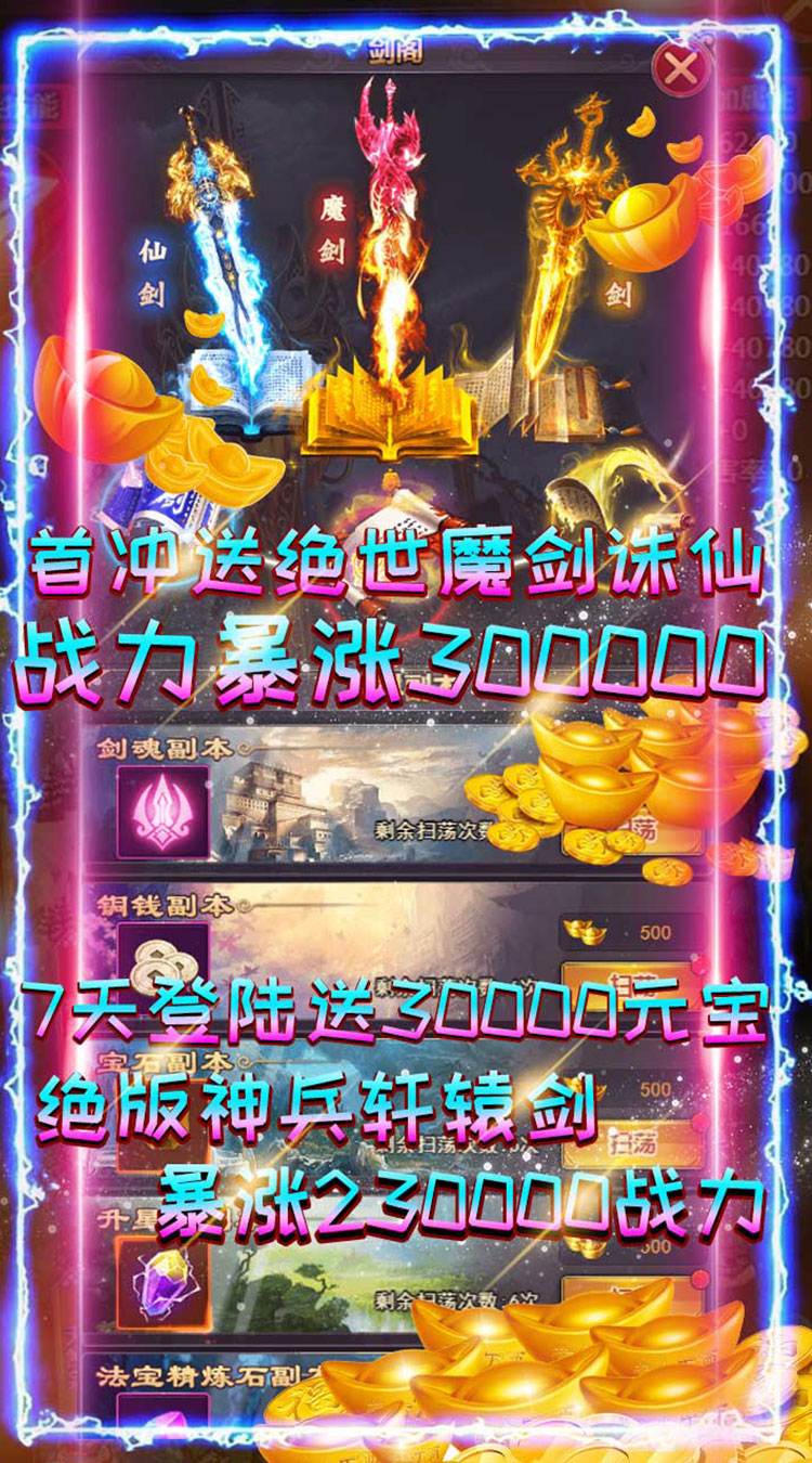 《龙王传说万抽版》是一款国风写实2.5D的仙侠RPG产品,手持3把光武战斗的游戏。版本福利强势来袭登录就送GM2,188888元宝,10000次抽奖,1800充值卡,新增一元商城在线天天领取充值卡,免费领取总价值5000RMB的VIP1-VIP12大礼包。仙魔灵3种族切换。各类法宝多重变身,脚踩法轮、背装翅膀、怀抱美人。在这里你将转世到虚构的修真世界展开一段全新里程,游戏内用现代时尚的观念全新演绎神兵。