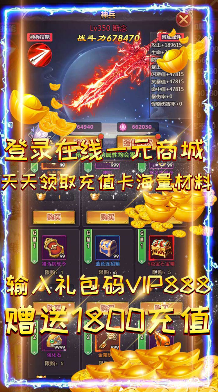 充值比例1:5000 上线福利: 福利1,上线赠送:GM2,元宝*188888,铜钱*8888W。 福利2,赠送1800元充值,输入礼包码:VIP888 福利3,赠送10000次抽奖,输入礼包码:KC888 福利4,一元商城登录在线天天领取充值卡,海量材料。 福利5,7天登陆送30000元宝+绝版神兵:轩辕剑—暴涨230000战力 福利6,免费领取总价值5000RMB的VIP1-VIP12大礼包 福利7,首冲送绝世魔剑诛仙战力暴涨300000+杀怪效率50% 正式开服时间:2020.09.23 10:00 首服